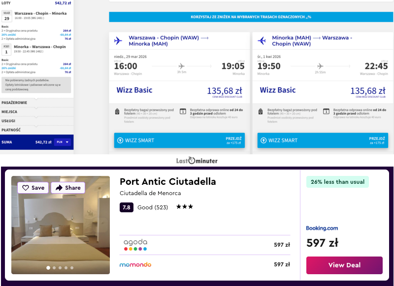 Oferta tanich przelotów to świetna propozycja dla tych, którzy marzą o krótkim urlopie w cieplejszym klimacie. Hiszpania cieszy się niesłabnącą popularnością, a Minorka ma w sobie wszystko, co najbardziej przyciąga – urocze plaże, niewielkie miasta z klimatem i sporo lokalnego kolorytu. Powietrze pachnie tam wiosną, pogoda zachęca zarówno do spacerów po kameralnych zatoczkach, jak i odkrywania wyspiarskich miasteczek. Nie jest ani za gorąco, ani za chłodno – w sam raz, by cieszyć się wczasami w spokojnym rytmie.Atrakcyjna cena biletu to dobry powód, by zrealizować plany, które często odkładamy – na później, na kiedyś, na lepszy moment. Ten moment właśnie się pojawił. Minorka oferuje nie tylko zachwycające krajobrazy i kąpiele w turkusowej wodzie, ale też możliwość oderwania się od codzienności bez konieczności przemierzania pół świata.