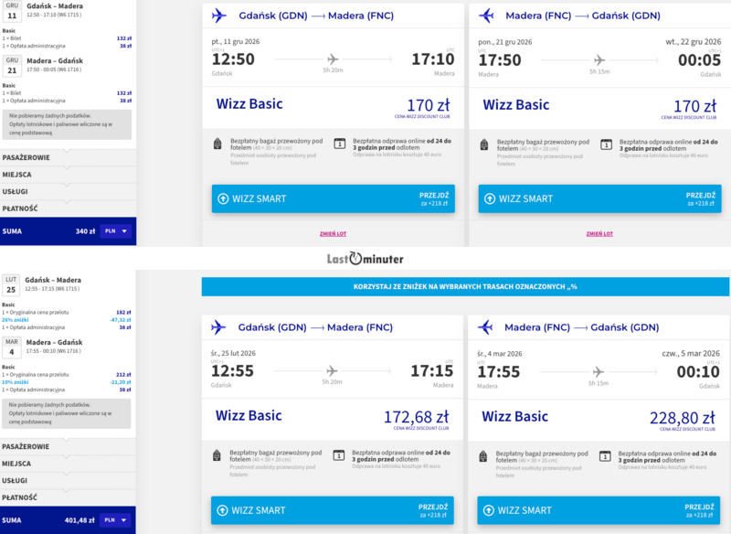 Loty z Gdańska na Maderę realizowane są przez linię Wizz Air. Mówimy o kierunku, który nie bez powodu cieszy się popularnością – Madera przyciąga zachwycającymi widokami, łagodnym klimatem przez cały rok i świetnymi warunkami do aktywnego wypoczynku.