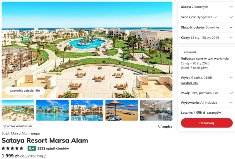 Wylot z Gdańska do słonecznego Marsa Alam to świetny sposób, by oderwać się od zimowej codzienności i zanurzyć w ciepłej atmosferze Egiptu. Sataya Resort położony tuż nad brzegiem Morza Czerwonego zaprasza na wypoczynek w naprawdę komfortowych warunkach – idealnych zarówno dla fanów plażowania, jak i tych, którzy lubią aktywnie spędzać czas.