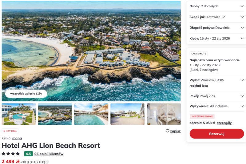 Jeśli marzysz o egzotycznym wypoczynku w środku zimy, lot z Wrocławia lub Katowic do słonecznej Kenii może być właśnie tym, czego szukasz. Celem podróży jest urokliwy Hotel AHG Lion Beach Resort, położony w jednym z najpiękniejszych zakątków wybrzeża – na cyplu nad zatoką Watamu.