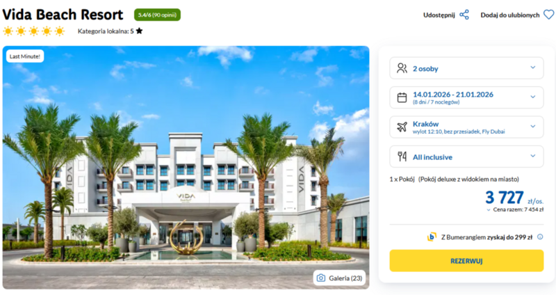 Wyloty z Krakowa, Katowic, Poznania i Warszawy do słonecznych Emiratów, a dokładnie do eleganckiego hotelu Vida Beach Resort w Umm Al Quwain, który oferuje standard 5 gwiazdek.