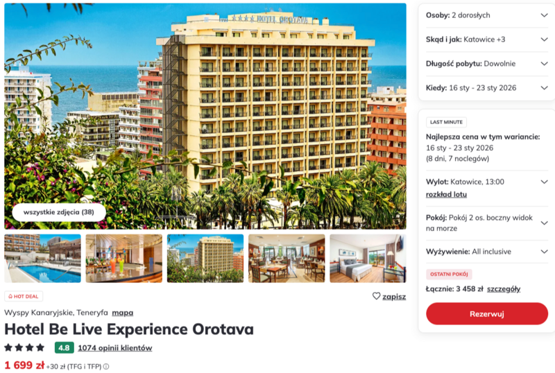 Wylot na Teneryfę zaplanowano z Katowic, a na miejscu czeka czterogwiazdkowy hotel Be Live Experience Orotava, oferujący wygodne zakwaterowanie i formułę all inclusive. To świetna opcja dla tych, którzy szukają połączenia relaksu z dobrym jedzeniem i komfortem.