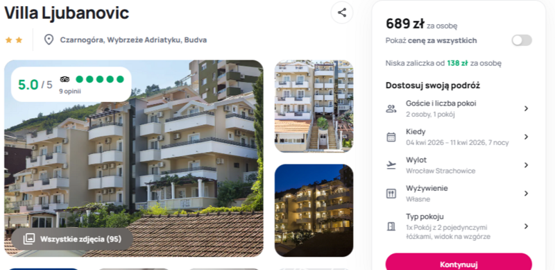 Wyloty z Wrocławia, Gdańska, Katowic i Krakowa prosto do słonecznej Czarnogóry, a dokładniej do Budvy – urokliwego miasta nad Adriatykiem. To właśnie tam znajduje się Villa Ljubanovic, hotel, który coraz częściej pojawia się w pozytywnych komentarzach podróżujących.