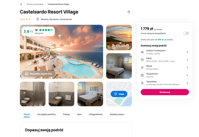 Na wiosenny wyjazd proponowany jest Castelsardo Resort Village — czterogwiazdkowy ośrodek na północy Sardynii. Do zatoki Cala Ostina jest ok. 100 m, jest prywatny dostęp do plaży, sezonowy basen oraz rozbudowane zaplecze sportowe i spa. Noclegi w bungalowach z balkonem lub werandą, klimatyzacją i minibarem. W standardzie zwykle dwa posiłki, z możliwością dopłaty do all inclusive lub wyboru wariantu ze śniadaniami.