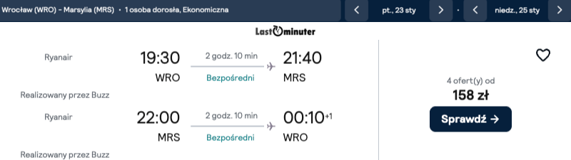 Wylot z Wrocławia do Marsylii to dobra opcja dla osób szukających korzystnych cen. Lot jest bezpośredni i trwa około 2 godziny i 10 minut, więc szybko i bez komplikacji dotrzesz na miejsce, bez czasu straconego na przesiadki.
