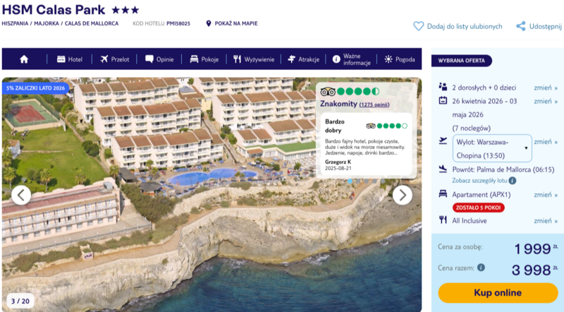Majówkowe wyloty z Warszawy, Gdańska, Katowic, Poznania i Wrocławia na Majorkę brzmią jak bardzo dobry plan. W tym terminie kierunek to HSM Calas Park w Calas de Mallorca, położony kilkaset metrów od plaży i z ładnym widokiem na morze.