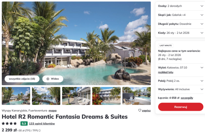 Wyloty z Katowic, Poznania, Warszawy i Wrocławia na Fuerteventurę z pobytem w R2 Romantic Fantasia Dreams & Suites to propozycja dla osób, które chcą odpocząć w spokojnym, wygodnym otoczeniu.