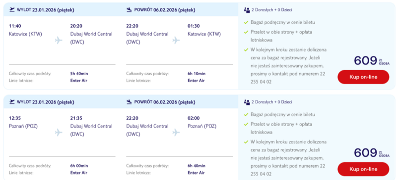 Wyloty z Katowic i Poznania do Dubaju wypadają na początek roku, w czasie ferii zimowych.