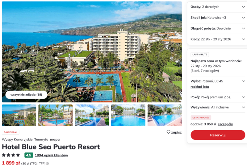 Biorąc pod uwagę standard hotelu i formułę all inclusive, cena wypoczynku wypada bardzo korzystnie. Obiekt położony jest w Puerto de la Cruz, z dogodnym dostępem do pobliskich plaż i atrakcji. To propozycja dla rodzin i par, które chcą spędzić czas w ładnej scenerii, próbując lokalnej kuchni i odkrywając uroki wyspy.
