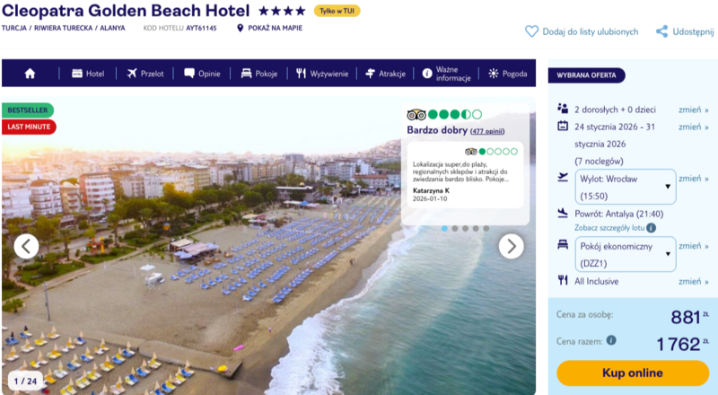 Podsumowując, wyjazd do Cleopatra Golden Beach to propozycja dla osób szukających wygody, słońca i przyjemnej lokalizacji przy jednej z najbardziej znanych plaż Riwiery Tureckiej. Przy sensownym stosunku jakości do ceny łatwo tu złapać oddech i nacieszyć się prostymi przyjemnościami wczasów.
