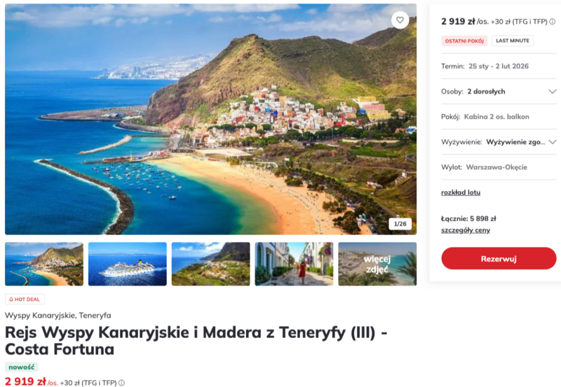 Rejs „Wyspy Kanaryjskie i Madera z Teneryfy” na pokładzie statku Costa Fortuna łączy wygodę z odkrywaniem nowych miejsc. Na trasie znajdują się Teneryfa, La Gomera, Fuerteventura, Lanzarote, Gran Canaria i Madera. W programie są wizyty w parkach narodowych, degustacje lokalnych specjałów i podziwianie niepowtarzalnych krajobrazów. Uczestnicy chwalą ciekawe trasy oraz komfort na statku.