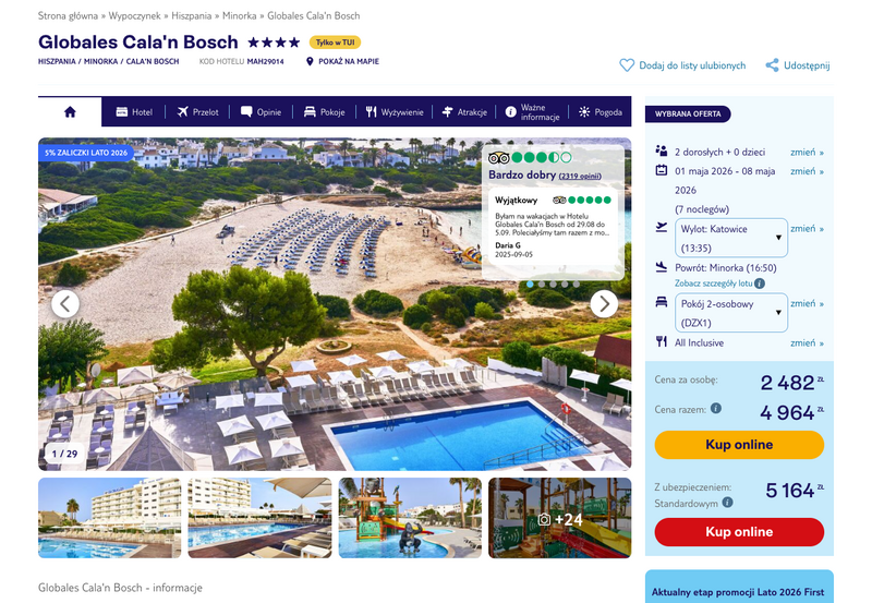 Pod względem relacji ceny do jakości oferta wypada korzystnie. Dzięki świetnej lokalizacji, udogodnieniom i wyżywieniu w formule all inclusive, wyjazd do Globales Cala'n Bosch to dobry wybór dla osób szukających wypoczynku i lekkiej rozrywki w ładnej scenerii. Warto rozważyć na majówkę.