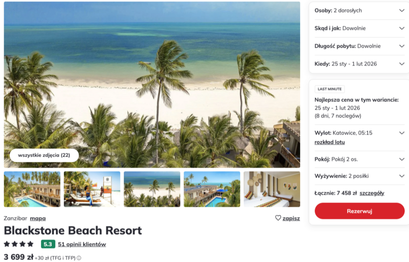 Biorąc pod uwagę standard hotelu i bogactwo okolicznych atrakcji, to propozycja warta uwagi. Odpoczynek można tu połączyć z poznawaniem kultury i smaków Zanzibaru, co czyni wyjazd szczególnie ciekawym.