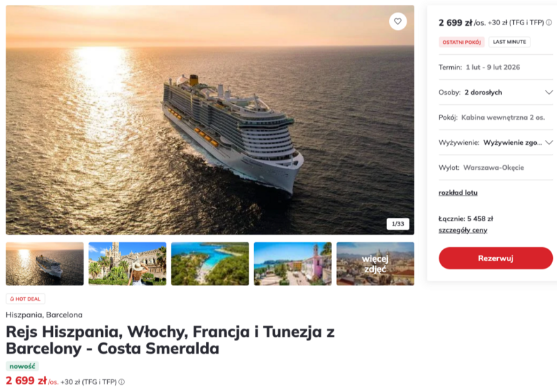 W programie zaplanowano rejs z przystankami m.in. we Włoszech, Francji i Tunezji. Na trasie są Palermo, Civitavecchia (tuż obok Rzymu) i Marsylia, więc będzie okazja zobaczyć zabytki i poczuć klimat nadmorskich miast. Na pokładzie Costa Smeralda czekają pokazy, koncerty i strefy wodne, więc wieczory nie będą się dłużyć.