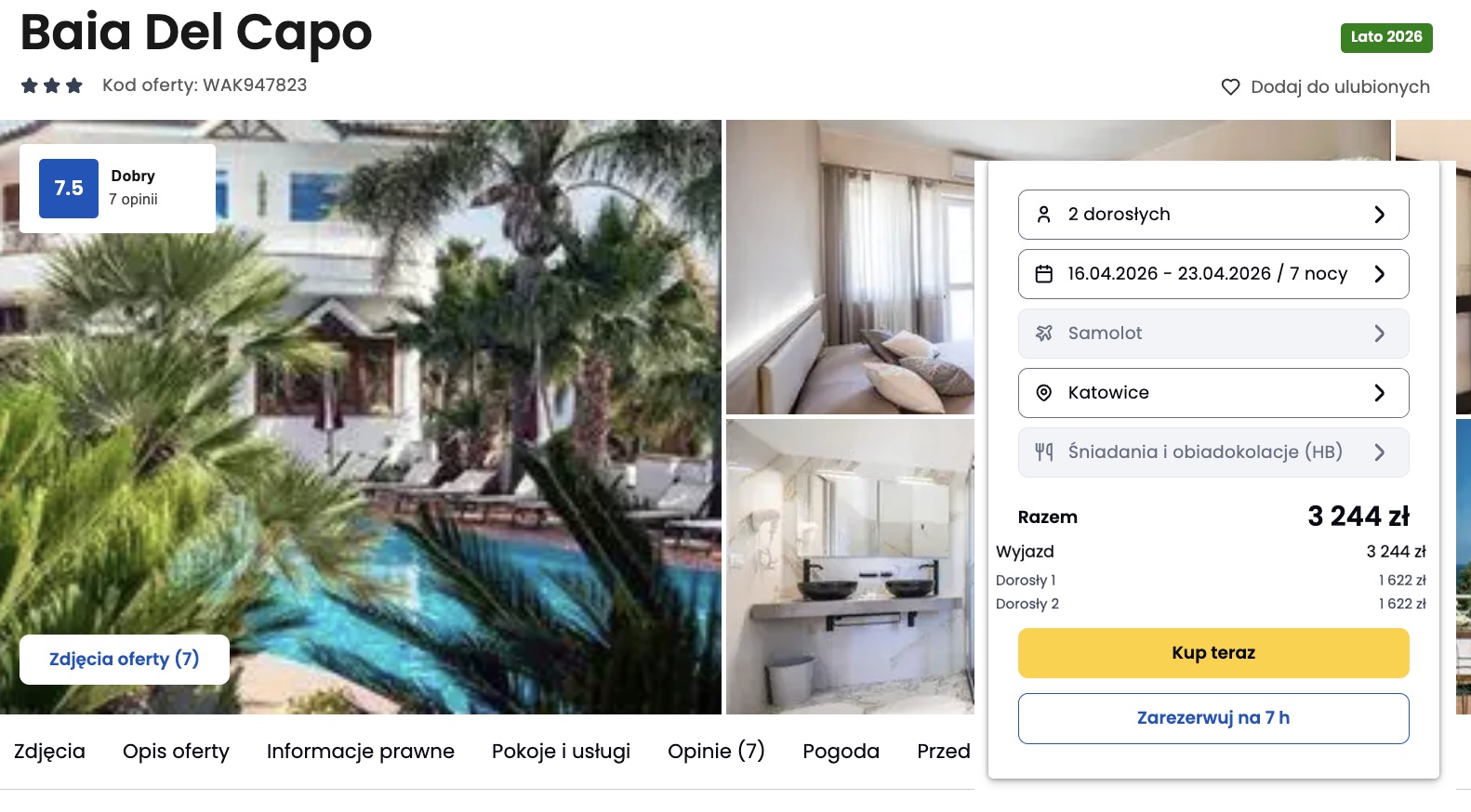 Cena obejmuje przelot oraz zakwaterowanie z wyżywieniem i wypada korzystnie na tle innych propozycji. Atutem jest połączenie dobrego położenia hotelu, licznych okolicznych atrakcji i sprzyjającej aury, co tworzy solidną bazę do udanego wypoczynku w Baia Del Capo.