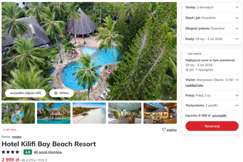 Kenia to świetny kierunek dla osób szukających egzotycznego wypoczynku, a Kilifi Bay Beach Resort sprzyja spokojnemu relaksowi. Leży w malowniczym Kilifi, tuż przy białej, szerokiej plaży i oferuje przyjemny, afrykański klimat. Hotel ma dobre opinie – goście często podkreślają czystość, estetykę i życzliwy personel, a także kameralną atmosferę sprzyjającą ciszy i odpoczynkowi.