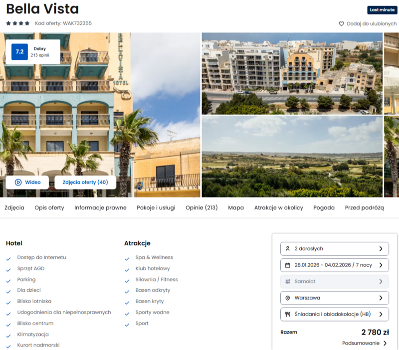 Pakiet z noclegiem w 3* hotelu Bella Vista w St. Paul’s Bay to praktyczna opcja. Do dyspozycji są baseny, siłownia i dwa posiłki dziennie, co uprzyjemnia pobyt. Blisko stąd do atrakcji, w tym do Valletty i świetnych plaż, więc to dobra baza do odkrywania wyspy.