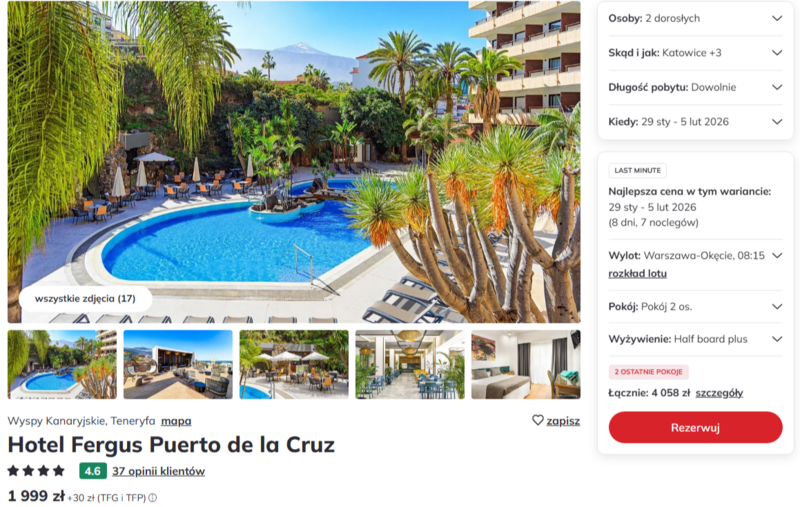 Wylot z Warszawy-Okęcia na Teneryfę to świetna okazja, by odpocząć w pięknym otoczeniu i złapać trochę słońca. Podróż zapowiada się komfortowo, a pobyt w hotelu Fergus Puerto de la Cruz to dobry wybór dla osób, które lubią łączyć relaks z aktywnym zwiedzaniem.