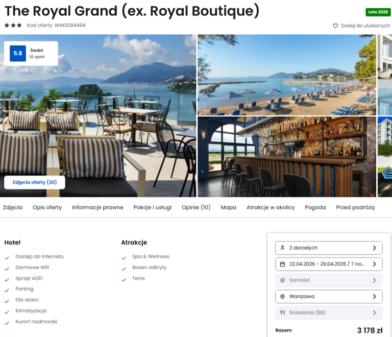Korfu to najbardziej zielona grecka wyspa, która przyciąga krajobrazami, pięknymi plażami i spokojnym tempem życia. 3* The Royal Grand cieszy się dobrymi opiniami, szczególnie jeśli chodzi o lokalizację – łatwo stąd dotrzeć zarówno do centrum wyspy, jak i do mało uczęszczanych, kameralnych miejsc. Goście chwalą również wygodne udogodnienia, takie jak dostęp do WiFi i rozsądne ceny, które pozwalają cieszyć się pobytem bez nadwyrężania budżetu.