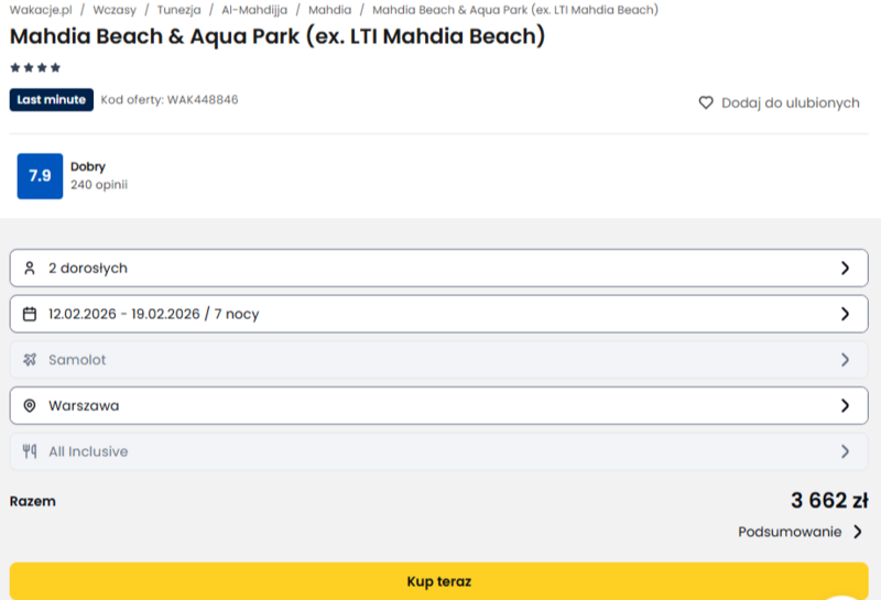 Hotel Mahdia Beach & Aqua Park z formułą all inclusive to dobra opcja dla rodzin z dziećmi i dla osób ceniących wygodę oraz różnorodność atrakcji. W zestawieniu z przystępną ceną ta propozycja wypada bardzo korzystnie i warto ją rozważyć, jeśli marzy się o bezproblemowych wakacjach w Tunezji.