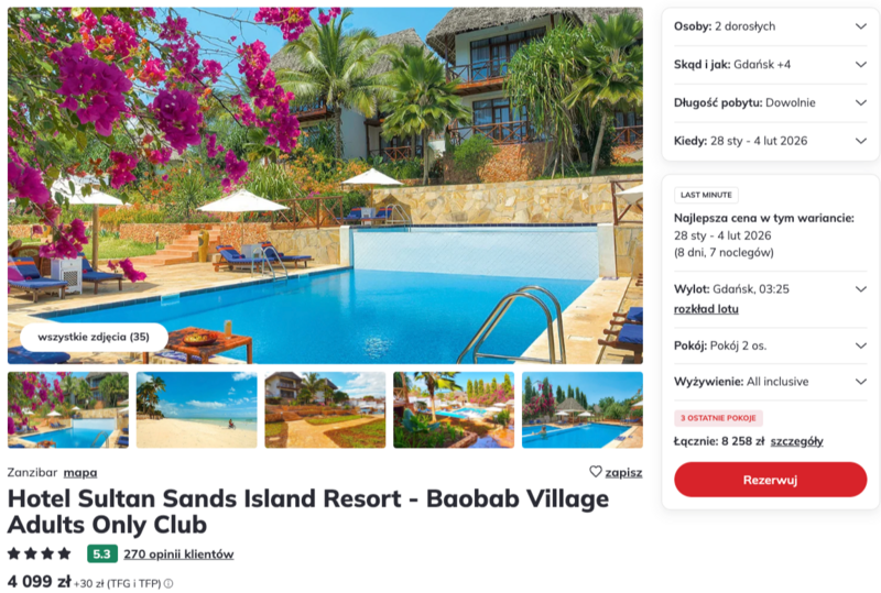 Wyloty z Gdańska i Poznania na Zanzibar to szybka zmiana scenerii: z codzienności prosto na białą plażę i turkus Oceanu Indyjskiego. Na miejscu czeka czterogwiazdkowy Sultan Sands Island Resort z częścią Baobab Village Adults Only Club, gdzie łatwo o spokój, wygodę i uważną obsługę.