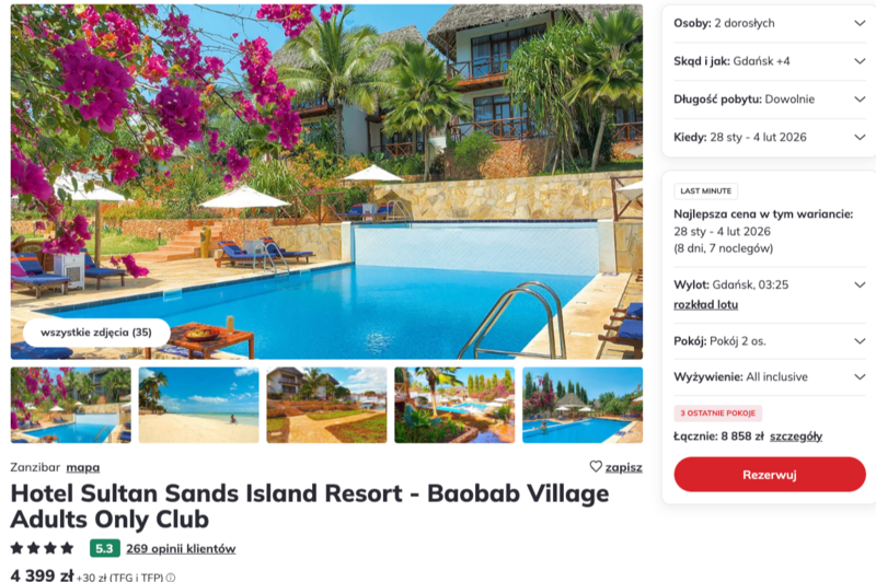 Wyloty z Gdańska i Poznania na Zanzibar to szybka zmiana scenerii: z codzienności prosto na białą plażę i turkus Oceanu Indyjskiego. Na miejscu czeka czterogwiazdkowy Sultan Sands Island Resort z częścią Baobab Village Adults Only Club, gdzie łatwo o spokój, wygodę i uważną obsługę.
