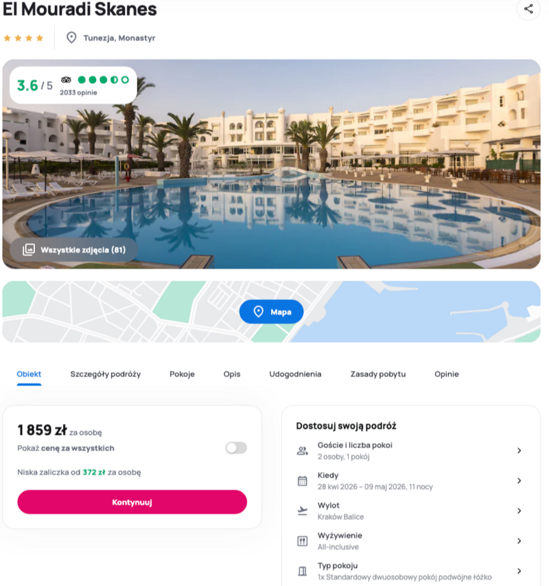 El Mouradi Skanes leży tuż przy Morzu Śródziemnym i oferuje czterogwiazdkowy standard z wygodnymi pokojami. Goście chwalą sprawną, uprzejmą obsługę i zadbane wnętrza. Dużym atutem jest program animacji, który wciąga i dorosłych, i najmłodszych, dzięki czemu łatwo połączyć relaks z odrobiną aktywności.