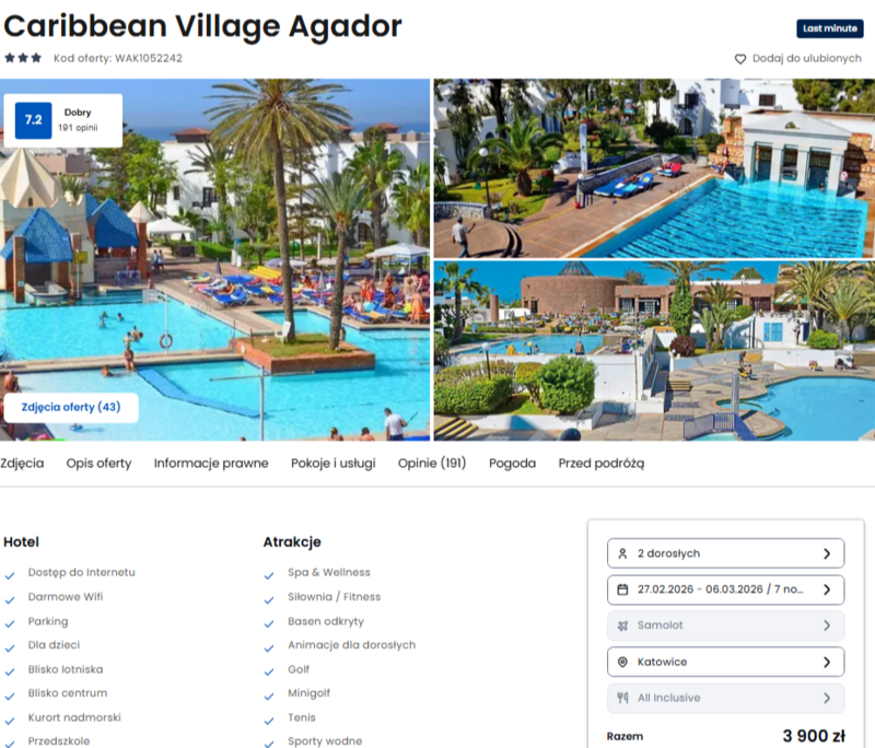 W ramach oferty dostępny jest 3* hotel Caribbean Village Agador, odpowiedni dla rodzin i par. Goście mają do dyspozycji komfortowe warunki, różnorodne aktywności sportowe oraz możliwość spróbowania lokalnej kuchni w hotelowych restauracjach. Opcja all inclusive ułatwia relaks, a bliskość plaży z prywatną strefą dla gości i kilka basenów sprawiają, że jest to dobre miejsce zarówno dla rodzin, jak i dla par. Pokoje z balkonami zapewniają komfort, a różnorodne bufety trafią w gust wielu smakoszy.