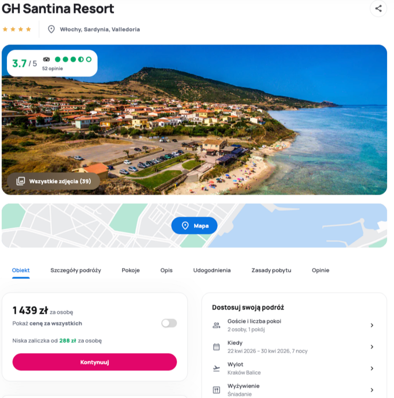 Proponowana wycieczka obejmuje pobyt w czterogwiazdkowym GH Santina Resort w Valledorii na Sardynii. Hotel leży około 500 metrów od plaży La Ciaccia, więc łatwo połączyć relaks nad morzem z krótkim spacerem. Na miejscu czekają basen, centrum fitness i spa, co sprawdzi się zarówno u rodzin, jak i par.