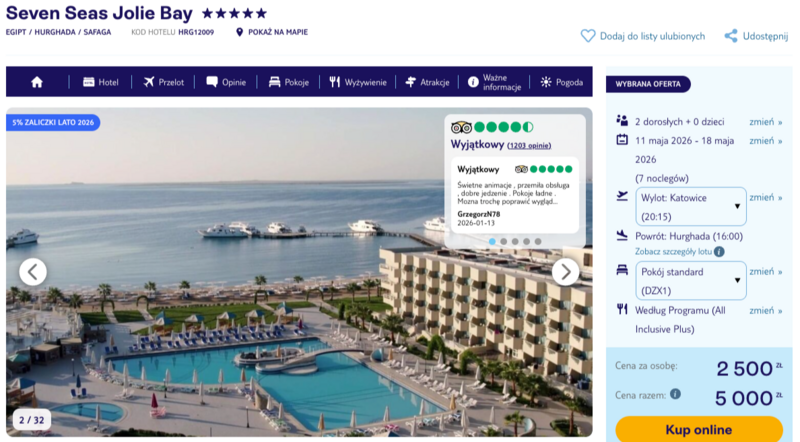 Szybkie loty z Katowic, Gdańska, Poznania, Warszawy i Wrocławia do Hurghady i już jesteś nad Morzem Czerwonym. Seven Seas Jolie Bay, położony w sercu zatoki Abu Soma, to miejsce, które dobrze sprawdzi się zarówno dla par, jak i rodzin z dziećmi – dużo przestrzeni, wygodne zaplecze i sporo pomysłów na spędzanie czasu.