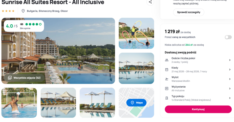 Wyloty do Bułgarii z Warszawy i Krakowa. Na miejscu przewidziano pobyt w Sunrise All Suites Resort w Obzorze.