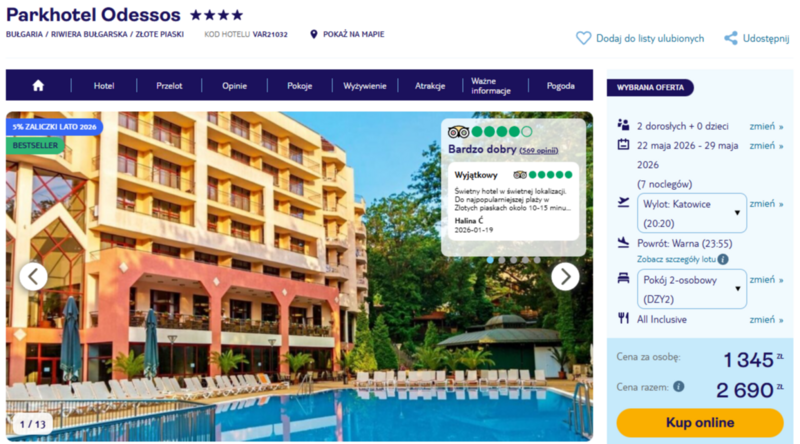 Biorąc pod uwagę lokalizację, standard i zakres świadczeń, Parkhotel Odessos to atrakcyjna propozycja na wygodny wypoczynek nad Morzem Czarnym bez nadmiernego obciążenia budżetu.
