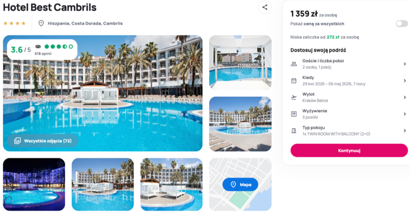 Hotel leży na malowniczej Costa Dorada, tuż przy pięknych plażach i niedaleko popularnego PortAventura World. Goście chwalą smaczne jedzenie i serdeczną obsługę, a w opiniach często przewijają się świeże ryby i owoce morza w hotelowej restauracji. Dodatkowy plus to animacje dla dzieci, dzięki którym miejsce świetnie sprawdza się na rodzinne wyjazdy.