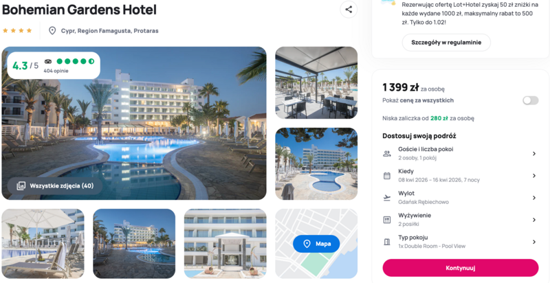 Wyloty z Gdańska, Krakowa, Warszawy do Larnaki. Na miejscu zaplanowany jest nocleg w Bohemian Gardens Hotel.