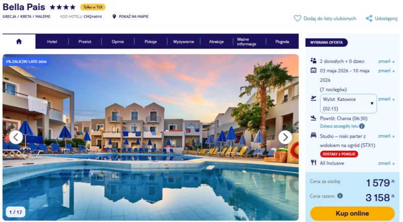 Hotel Bella Pais, położony około 20 minut od malowniczej Chanii, sprawdza się jako baza na wypoczynek. Czekają tu przestronne pokoje z balkonami i tarasami, a do tego basen, brodzik dla dzieci, siłownia i sala gier. Goście często podkreślają kameralny klimat i życzliwą obsługę. Wariant all inclusive pozwala korzystać z posiłków i napojów przez cały dzień, co dodaje wygody podczas pobytu.