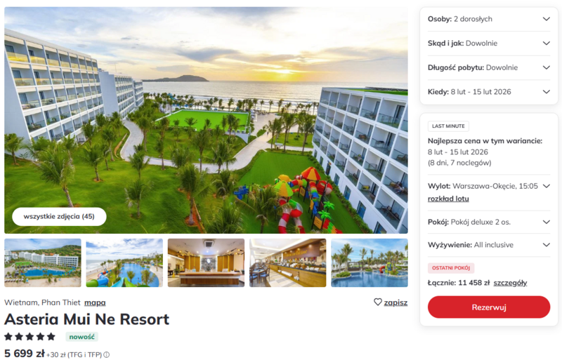 Wylot z Warszawy do Azji prowadzi prosto do Asteria Mui Ne Resort w Phan Thiet. To 5‑gwiazdkowy hotel w formule all inclusive, z posiłkami w formie bufetu i szerokim wyborem napojów. Goście chwalą uprzejmą obsługę oraz świeże, lokalne dania serwowane w dwóch restauracjach. Na miejscu czeka basen infinity z kolorowymi zjeżdżalniami, plac zabaw i animacje dla dzieci, więc to wygodna opcja także dla rodzin.