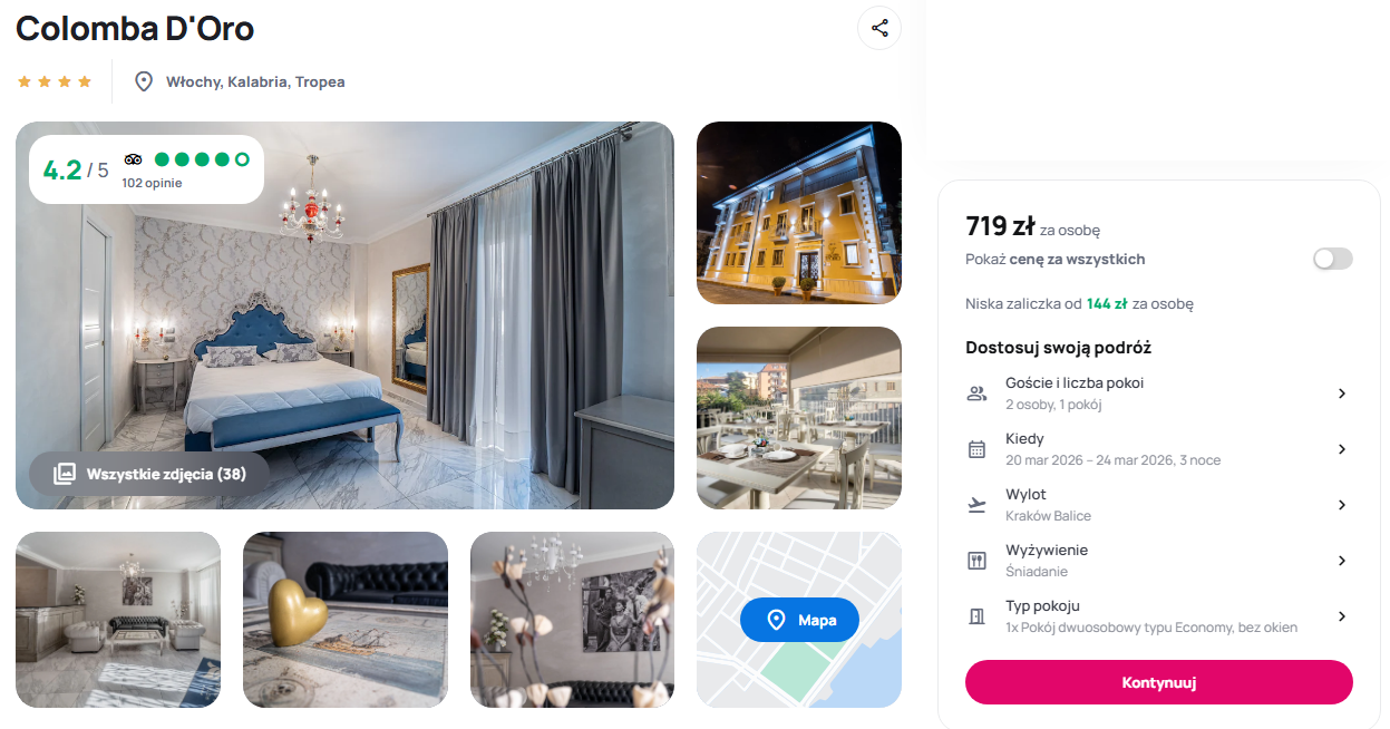To dobry moment, by odkryć uroki Kalabrii. 4* hotel Colomba D'Oro, w którym planowany jest pobyt, zbiera pozytywne opinie gości. Położony około 10 minut spacerem od plaży, sprawdza się zarówno na spokojny relaks, jak i na lekkie zwiedzanie. W okolicy czekają m.in. Katedra Normanów i Monaster Santa Maria dell'Isola, które dodają wyjazdowi kulturalnego charakteru.