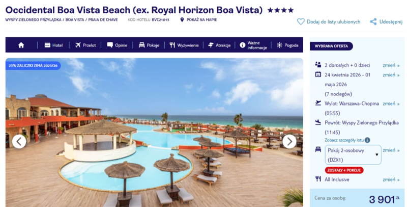 Pobyt w 4* Occidental Boa Vista Beach (dawniej Royal Horizon Boa Vista) to wygodna opcja dla osób ceniących relaks i komfort. Hotel jest wysoko oceniany za położenie przy szerokiej, piaszczystej plaży, dbałość o czystość i życzliwą obsługę. Wyżywienie all inclusive z dużym wyborem dań i napojów sprawia, że wypoczynek staje się naprawdę bezproblemowy.