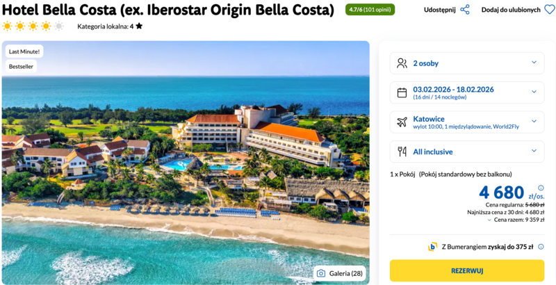 Hotel Bella Costa (dawniej Iberostar Origin Bella Costa) to propozycja dla osób, które chcą odpocząć w komfortowych, a miejscami i luksusowych warunkach. Obiekt leży tuż przy jednej z najpiękniejszych plaż Varadero, z jasnym, drobnym piaskiem i turkusową wodą. Goście często chwalą piaszczystą plażę, świetną obsługę, rozbudowaną infrastrukturę oraz szeroki wybór atrakcji.