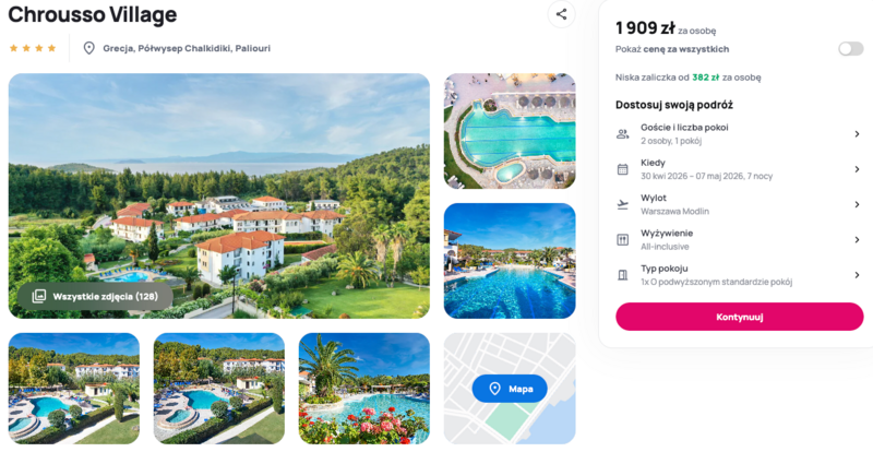 To dobry wybór na urlop w greckim klimacie. Czekają tu wygodne pokoje o podwyższonym standardzie, a całość otaczają bujne ogrody i sosnowe lasy. Blisko jest plaża Chrousso, a także Laguna w Pefkochori i port Glarokavos, więc to świetna baza do odkrywania okolicy. Obiekt jest przyjazny rodzinom i oferuje sporo udogodnień dla dzieci i dorosłych.
