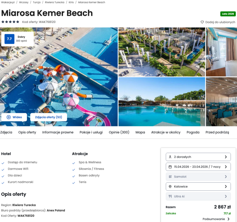 Cena wygląda korzystnie w zestawieniu z komfortem, lokalizacją i możliwościami spędzania czasu na miejscu i w okolicy. Miarosa Kemer Beach, jako hotel 5*, oferuje liczne udogodnienia i przestrzenie do relaksu, więc to propozycja dla osób szukających wszechstronnych wczasów. Sporo pozytywnych opinii i różnorodne atrakcje sprawiają, że ten wyjazd może okazać się udanym wyborem.