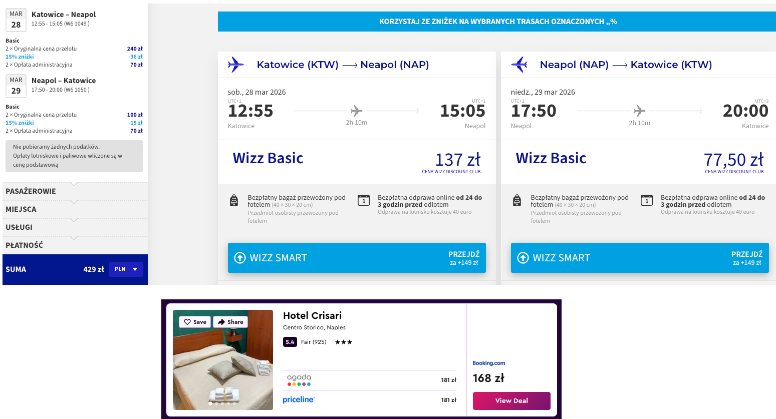 W systemie rezerwacyjnym przewoźnika znajdują się korzystne ceny na loty z Katowic do Neapolu. Bezpośrednie połączenie i wygodny czas lotu sprawiają, że to praktyczna opcja.Wczesna wiosna w Neapolu bywa łagodna, idealna na zwiedzanie. Temperatury są przyjemne, sprzyjają długim spacerom, a opadów jest zwykle niewiele, więc szanse na słońce są duże. To dobry moment, by cieszyć się włoską kulturą i kuchnią na świeżym powietrzu.