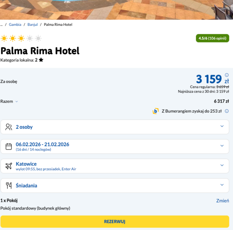 Z Katowic polecisz bezpośrednio do Banjulu, stolicy Gambii. Lot trwa około 7 godzin i 20 minut, więc to wygodna opcja na egzotyczny urlop. W pakiecie tanich wczasów masz nie tylko przelot, ale też transfery do hotelu, co upraszcza organizację wyjazdu.
