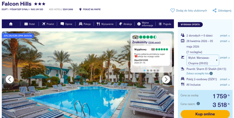 Nawet jeśli znasz już Egipt, ten kierunek pozwala spojrzeć na niego z nowej perspektywy. Falcon Hills sprawdzi się u osób szukających spokoju i relaksu w ładnym otoczeniu. Bliskość plaży oraz bogata oferta atrakcji sprawiają, że to ciekawa propozycja na urlop w "gorącym" okresie wypoczynkowym.