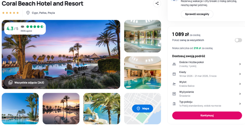 Wyloty z Krakowa i Wrocławia do Pafos to szybka droga do słońca i spokojnego tempa dnia. Coral Beach Hotel and Resort, położony tuż przy plaży i otoczony pięknymi widokami, sprawdza się jako wygodna baza do odkrywania wyspy.