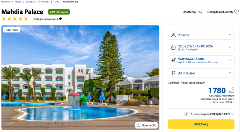 Mahdia Palace, pięciogwiazdkowy hotel tuż przy plaży, to propozycja dla osób ceniących wygodę i spokojną okolicę. Na miejscu czekają m.in. basen, spa, kluby sportowe i program animacyjny. W opcji all inclusive wliczone są posiłki oraz lokalne napoje.