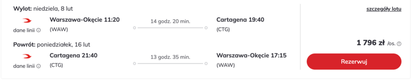 W tytułowej cenie jest dostępny tylko jeden bilet. Podróż trwa około 14 godzin. W terminie wyjazdu można nacieszyć się słońcem i urokami kolumbijskiego wybrzeża. W tym okresie pogoda jest zazwyczaj przyjemna: temperatury sięgają około 30°C, a opadów jest niewiele, więc łatwo zaplanować plażowanie i zwiedzanie.