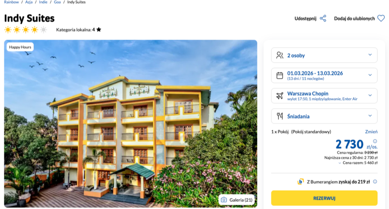 Marzysz o ucieczce od szarej codzienności prosto w objęcia gorącego, indyjskiego słońca? Ta egzotyczna wyprawa z 2 polskich miast do stanu Goa to Twoja przepustka do raju, gdzie złociste plaże i szum palm stają się częścią każdego poranka. Wyobraź sobie relaks w wyjątkowym hotelu Indy Suites w tętniącym życiem Candolim, który oczaruje Cię mariażem nowoczesnego luksusu z lokalnym kolorytem. To miejsce stworzone dla tych, którzy pragną kameralnej atmosfery, przestronnych wnętrz i kojącego odpoczynku nad basenem lub podczas krótkiego spaceru na pobliskiej plaży.