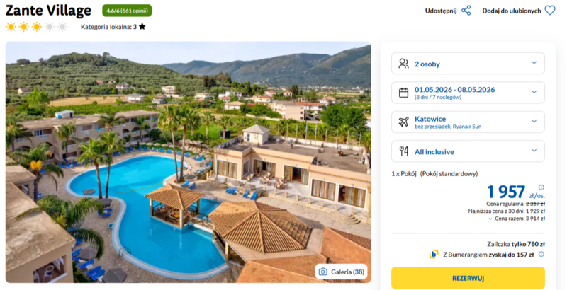 Wyobraź sobie idealny początek sezonu na skąpanej w słońcu greckiej wyspie Zakintos, gdzie błękit nieba spotyka się z turkusem morza. Ta wyjątkowa propozycja z wylotem z Katowic, Warszawy lub Wrocławia to twój bilet do raju, w którym w otoczeniu malowniczej zieleni i majestatycznych gór odnajdziesz upragniony spokój. Hotel Zante Village czeka na ciebie słynąc z gościnności i oferując relaks przy basenie i komfortowe pokoje, które goście regularnie chwalą za nienaganną czystość i domową atmosferę.