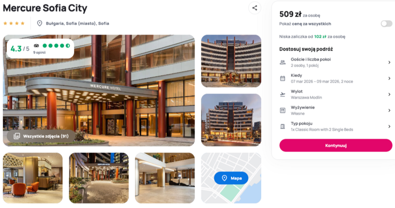 Podróż do Sofii pozwala na odkrycie fascynującego połączenia antycznej historii z nowoczesnym rytmem europejskiej metropolii. Noclegi przewidziano w nowoczesnym, 4* hotelu znanej sieci Mercure Sofia City, który zbiera bardzo dobre recenzje od odwiedzających. Goście szczególnie chwalą nienaganną czystość, pomocną obsługę oraz wysoką jakość serwowanych śniadań (dodatkowo płatne). Obiekt położony jest w spokojnej dzielnicy, co gwarantuje relaks po dniu pełnym zwiedzania, a jednocześnie oferuje szybki dostęp do najważniejszych punktów miasta, takich jak słynny bulwar Witosza czy Narodowy Pałac Kultury.